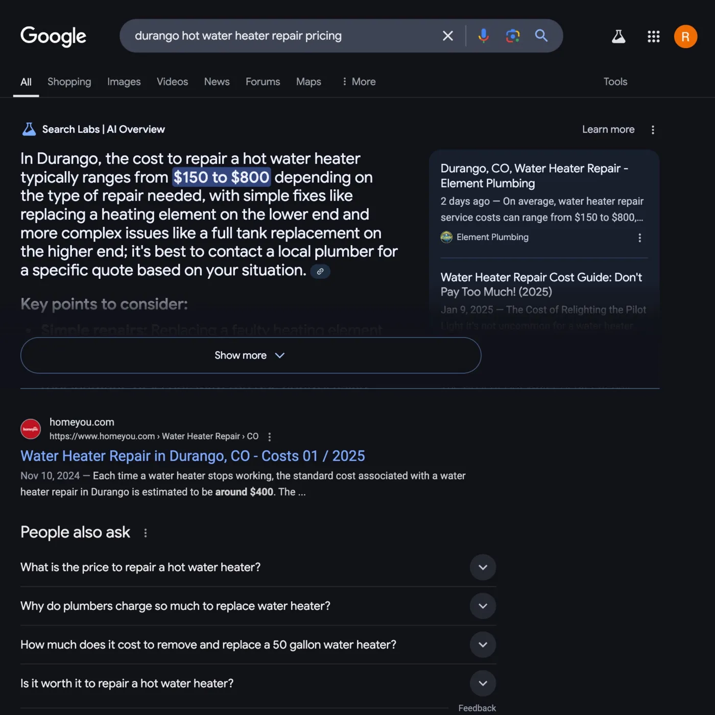 As you can see, Google’s AI pulls information from other top-ranking sources to create its answer to the search query, “durango water heater repair pricing.